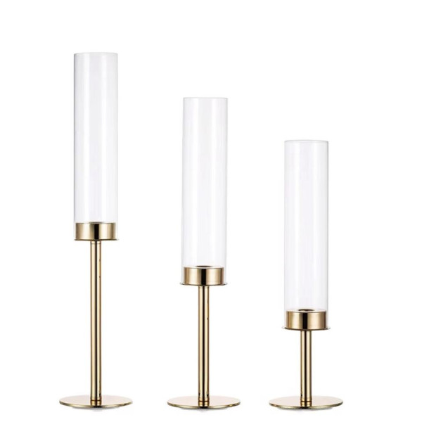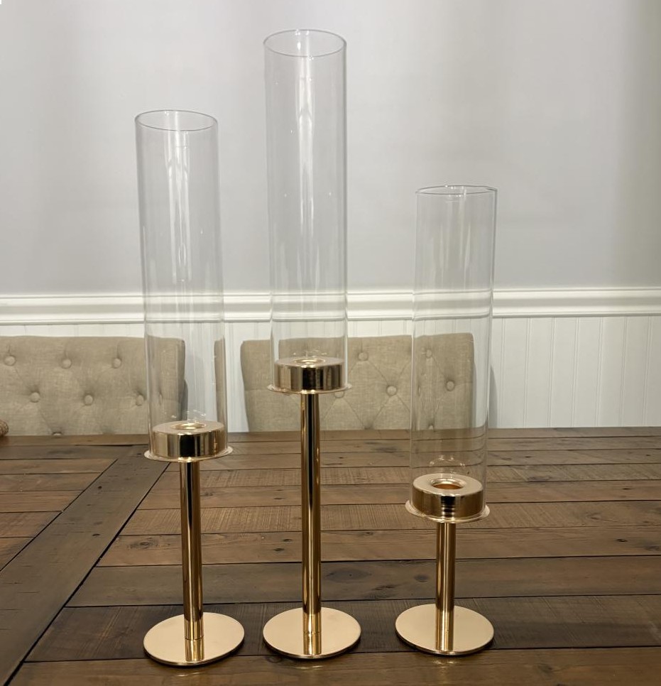 Add a touch of elegance and warmth to your event décor with our Gold Candle Holders Set of 3. This set includes three coordinating candle holders in varying heights, crafted with a sturdy gold metal base and topped with clear removable glass covers for a refined, upscale look.