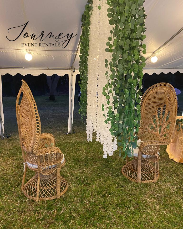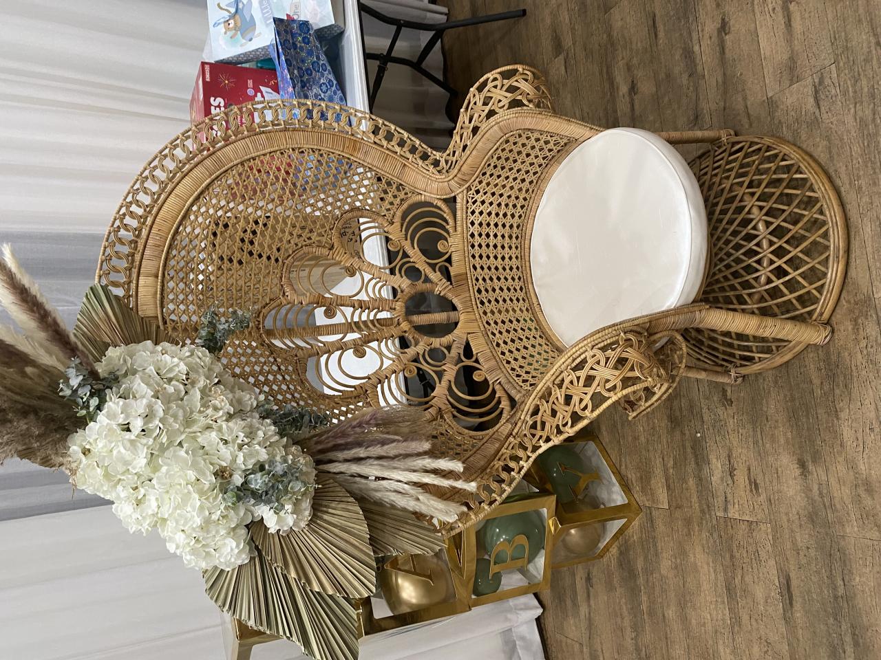 The perfect addition to any event, the Peacock Wicker “Boho” Chair adds a unique touch of style to whatever occasion you are hosting. With an intricate and eye-catching design, this chair features a classic yet luxurious look with its high-quality wicker construction and elegant peacock detailing. Its sturdy frame ensures it can handle the weight of whoever is sitting in it while its plush cushioning guarantees added comfort. Perfect for parties, weddings, bar and bat mitzvahs, engagements, conferences, gender reveals and more, this chair is sure to make your gathering even more special. Ideal for both indoor and outdoor settings, the Peacock Wicker “Boho” Chair is sure to be a conversation starter at every event!